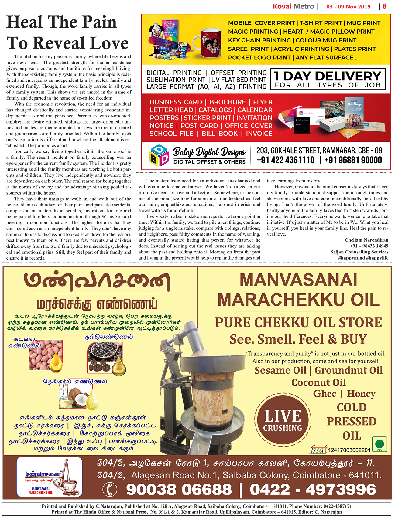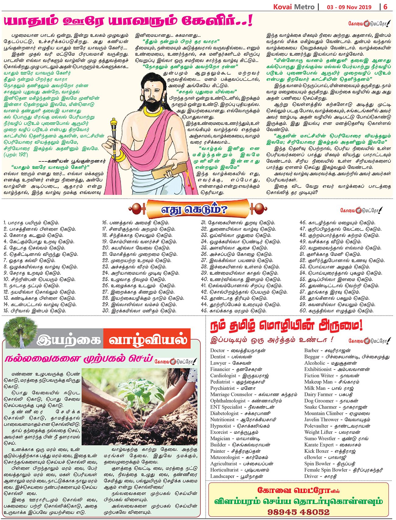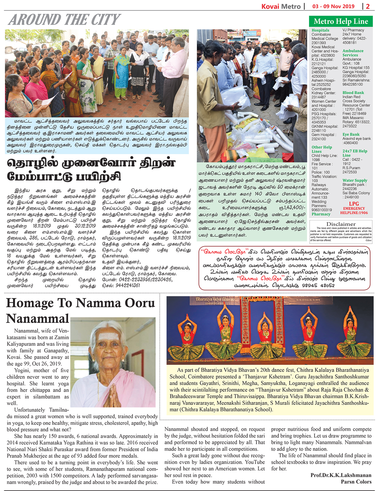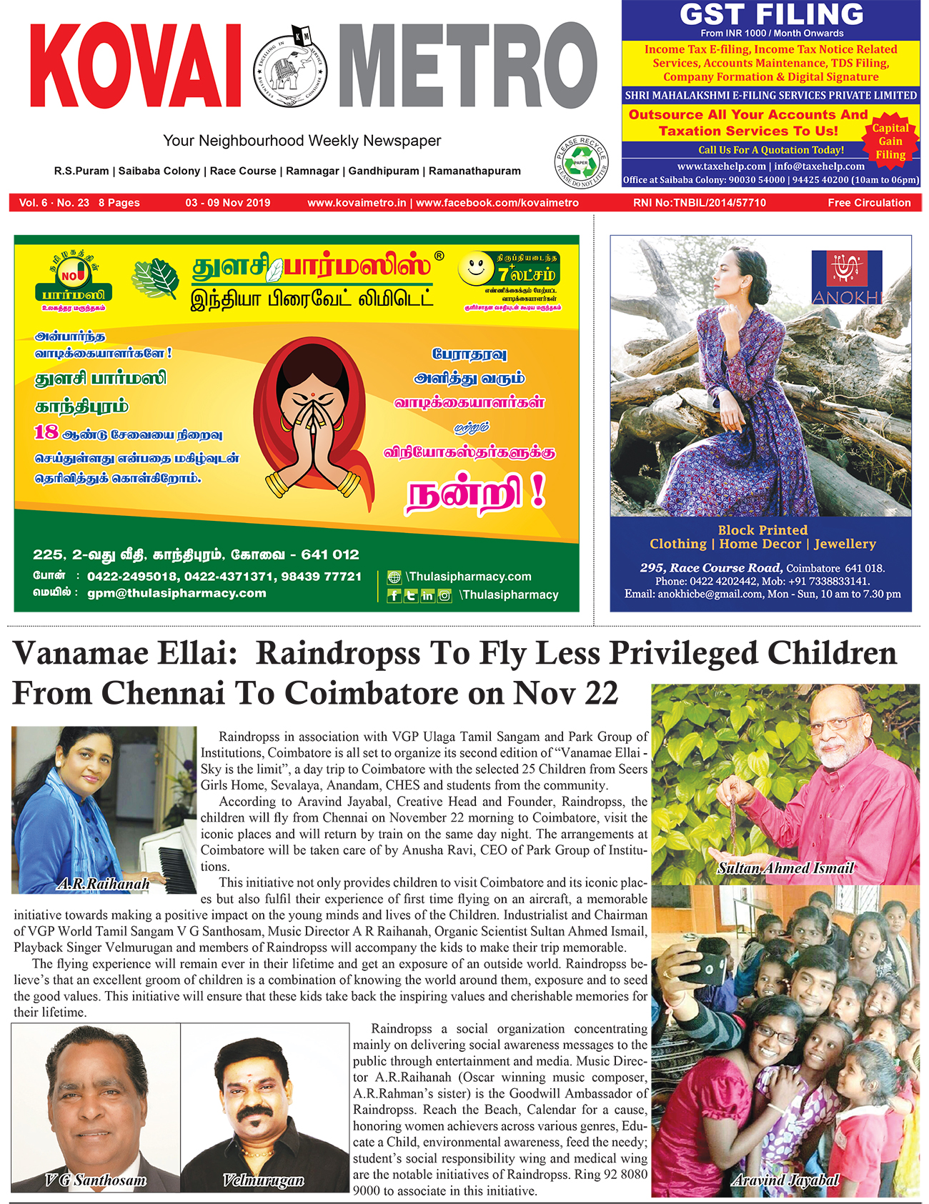 Vol 6 – Issue 23, KOVAI METRO, Neighbourhood Weekly Newspaper, Coimbatore November 6, 2019 Kovai Metro